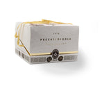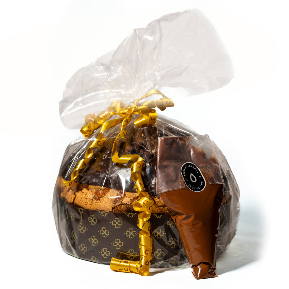 Il Panettone Artigianale al Cioccolato Peccati di Gola 1976 è un’esperienza sensoriale completa: nasce da un impasto soffice a lievitazione naturale, ricco di gocce di cioccolato fondente e ricoperto da una glassa al cacao che lo rende unico già al primo sguardo.